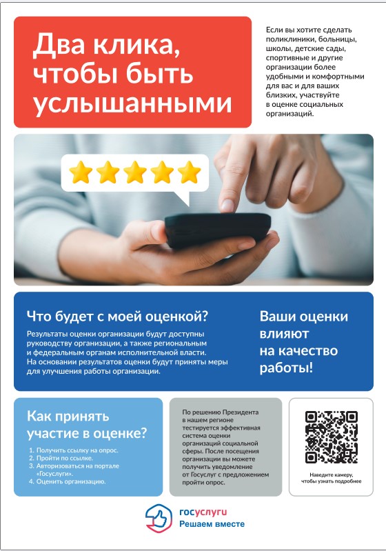 В России проходит эксперимент по внедрению эффективной системы оценки услуг организаций социальной сферы. Она разработана Минтрудом России и Минцифры России при методической поддержке Агентства стратегических инициатив (АСИ) во исполнение решения Президента России. Эта система позволит получить обратную связь об организации социальной сферы и выяснить удовлетворенность граждан качеством дошкольного и школьного образования и медицинской помощи, проведения медико-социальной экспертизы, а также работы организаций физкультуры и спорта.
